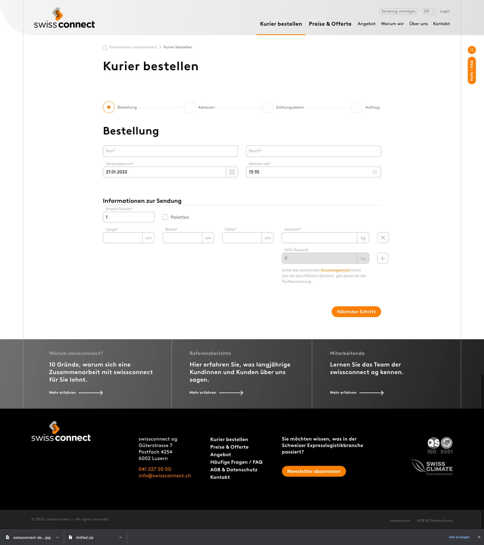 Der Onlineauftritt von Swissconnect vereint Corporate Website und Webapplikation in einem. Die im Jahr 2020 komplett überarbeitete Website steht die hohe Funktionalität im Vordergrund. So werden die User:innen mit dem promiment platzierten Preis- und Lieferzeitenrechner schnell und einfach in den Bestellprozess geführt.